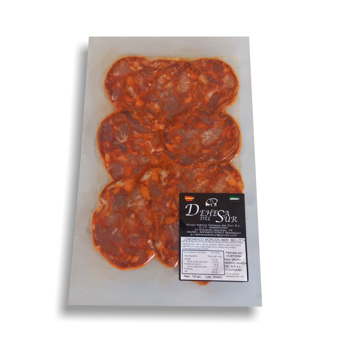- Ingredientes: Carne de cerdo ibérico, sal, ajo, pimentón, dextrina, dextrosa, proteína plasmática de cerdo, isoascorbato sódico, extracto de pimentón, conservadores (E-252 y E-250).